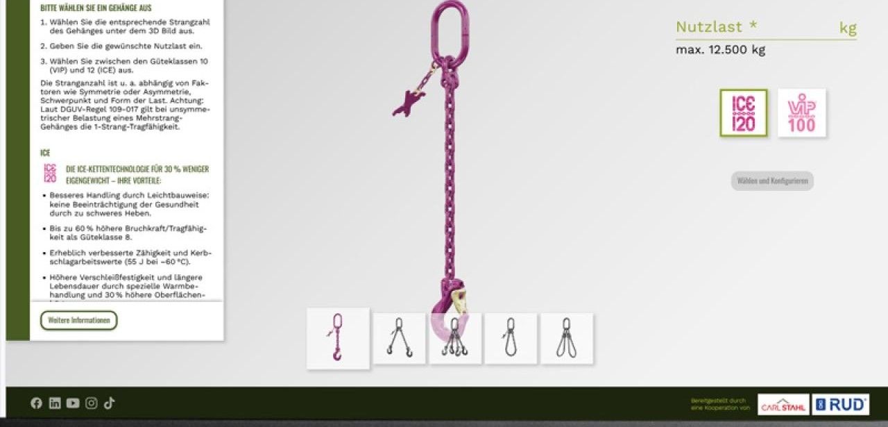 Durch den Carl Stahl Online-Konfigurator lassen sich Kettengehänge mit RUD VIP- oder ICE-Komponenten exakt dimensionieren. In sechs Schritten wählen Anwender Stranganzahl, Nutzlänge und Anschlagwinkel, prüfen das virtuelle 3D-Modell und vergleichen Tragfähigkeiten. RUD VIP (Güteklasse 10) bietet bis zu 30 Prozent höhere Bruchkraft, ICE (Güteklasse 12) punktet mit bis zu 60 Prozent Leistungsvorteil. Normkonforme Ergebnisse, kürzere Planungszyklen und erweiterte Serviceleistungen steigern Qualität und Effizienz in allen Hebeanwendungen in verschiedenen Industriebereichen erheblich.