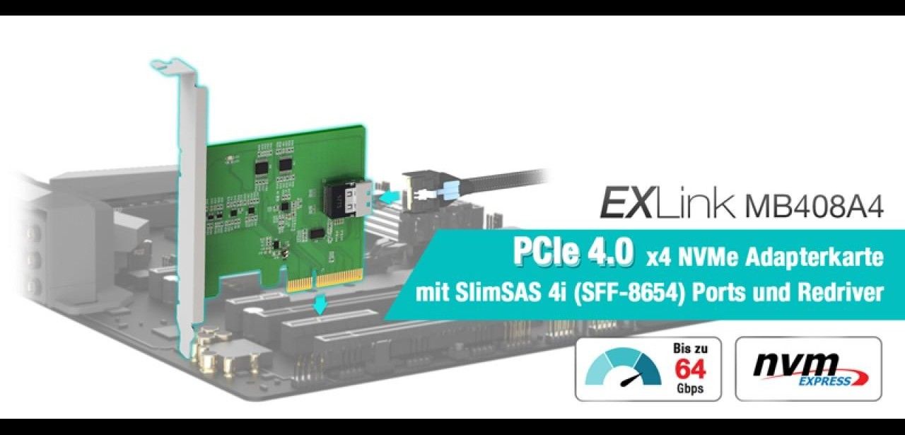 Mit der EXLink MB408A4 Adapterkarte lassen sich PCIe Gen4 x4 Signale mit einer Bandbreite von bis zu 64 Gbps übertragen. Die SlimSAS 4i (SFF-8654) Verbindung sorgt für zuverlässige NVMe-Datenraten und führt die Hochgeschwindigkeitsübertragung über übliche Leiterbahngrenzen des Mainboards hinaus. Dadurch entsteht eine flexible Infrastruktur, die leistungsstarke NVMe-Speicherlösungen unterstützt und eine stabile Signaldurchführung auch über längere Kabelstrecken gewährleistet. Anwender profitieren von erhöhter Planbarkeit und Skalierbarkeit bei optimiertem Datendurchsatz und maximaler Effizienz.